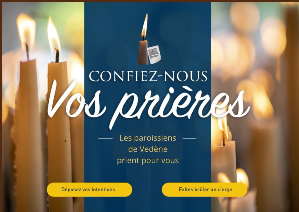Si vous désirez nous confier une intention particulière, n’hésitez pas à nous envoyer vos demandes par courriel à paroisse.vedene@gmail.com ou en dépossant une intention au panier que vous trouverez à l’entrée de l’église lors des messes dominicales.